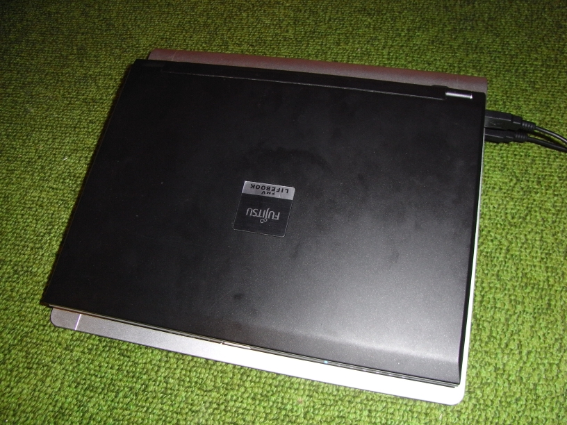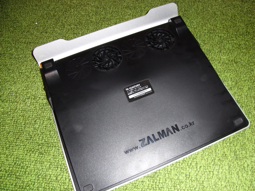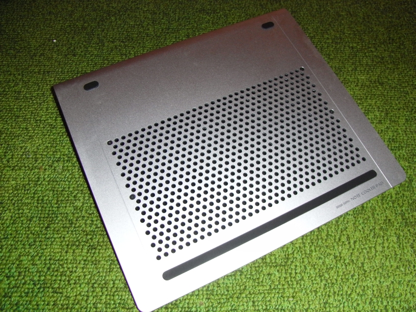 買ったのは、SANWA SUPPLY TK-CLN7USV。 A4Lサイズ対応のアルミ製ノートクーラーである。 黒いのは滑り止めのラバー。 表面には678個の通気口があり、後方のツインファンから送風される。 アルミはDSA(ダイヤモンド加工、砂吹き、陽極酸化処理)技術で表面処理加工 されているらしい。 裏側。「ZALMAN」というのは、韓国のコンピュータ用冷却装置メーカー。 製造がZALMAN、日本国内の販売がSANWA SUPPLYということなのだろう。 ツインファン。遠心ファンというものらしい。ここから表面の通気口へ送風する。 回転数の調整が可能。箱には超静音と書いてあるが、最低回転数でも 周りが静かであれば回転音が聞こえる。最高回転数になれば音も大きくなるが、 PCのファンの回転が落ちるのでそんなに気にならない。 右側面。左のダイヤルでファンの回転数を調整する。 赤いのはPowerLED、その右がスイッチ。USBポートが二つあるが、ひとつは給電用。 もうひとつは給電のためにポートをつぶさないようにするための中継用。 付属のUSBケーブル。これで給電する。 ノートパソコン(外寸314mmx234mm)をのせたところ。パッド自体が傾斜しているので キー面も当然傾くが、実にちょうどいい傾き加減で、疲れも減った。 接続部。黒いケーブルが給電用、灰色のはマウスのもの。 使い始めて一日経ったが、オンラインゲーム中にエラーが起きることはなくなり、 PCの排気口から出てくる空気も、まえは熱風だったのがぬるい程度になった。 起動してしばらく経った時の動作も軽くなった。自分の場合は、買ってよかったと思っている。 外箱に記載されている仕様は以下の通り。 品番:TK-CLN7USV 品名:ノート用クーラーパッド 重量:約1.195kg 外寸:W330xD308xH40mm 騒音:18.0~25.5dBA(±10%) 電圧:5V(ノートPC USBパワー使用) 付属:USBケーブル <ファン仕様> 数量:2個 ベアリングタイプ:Hypro Sleeve ファン速度:1,100~1,500rpm(±10%) PR