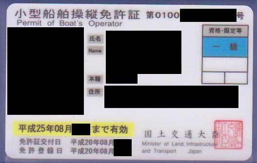 普通や二輪ではなく、小型船舶の免許である。 ケース。水に浮く。 試験があってからだいぶ経っていたので、不合格だと思っていた。 これが免許証。誰だか判らない・・・・・・・・はず。 この免許で操縦できる船舶、水域は以下のとおりである(海事局海技資格課より)。 ・船舶:総トン数20トン未満の船舶 ただし、20トン以上の場合でも、 1.一人で操縦を行う構造であるもの 2.長さが24メートル未満であるもの 3.スポーツ又はレクリエーションのみに用いられるもの(漁船や旅客船等の業務に用いられないもの) ・水域:無制限 ただし、沿海区域の外側80海里(約150キロメートル)未満の水域以遠を航行する場合は、 六級海技士(機関)以上の資格を受有する者を乗り組ませねばならない。 PR