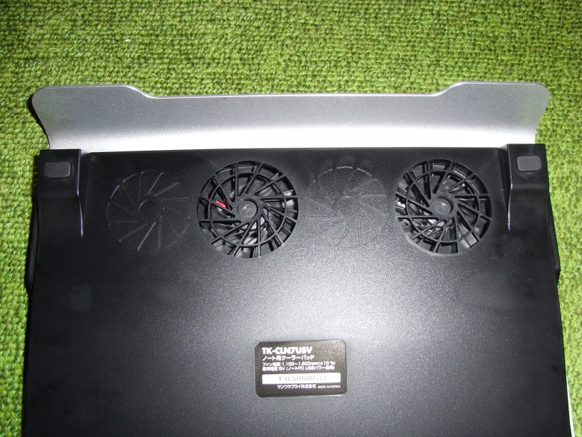 買ったのは、SANWA SUPPLY TK-CLN7USV。 A4Lサイズ対応のアルミ製ノートクーラーである。 黒いのは滑り止めのラバー。 表面には678個の通気口があり、後方のツインファンから送風される。 アルミはDSA(ダイヤモンド加工、砂吹き、陽極酸化処理)技術で表面処理加工 されているらしい。 裏側。「ZALMAN」というのは、韓国のコンピュータ用冷却装置メーカー。 製造がZALMAN、日本国内の販売がSANWA SUPPLYということなのだろう。 ツインファン。遠心ファンというものらしい。ここから表面の通気口へ送風する。 回転数の調整が可能。箱には超静音と書いてあるが、最低回転数でも 周りが静かであれば回転音が聞こえる。最高回転数になれば音も大きくなるが、 PCのファンの回転が落ちるのでそんなに気にならない。 右側面。左のダイヤルでファンの回転数を調整する。 赤いのはPowerLED、その右がスイッチ。USBポートが二つあるが、ひとつは給電用。 もうひとつは給電のためにポートをつぶさないようにするための中継用。 付属のUSBケーブル。これで給電する。 ノートパソコン(外寸314mmx234mm)をのせたところ。パッド自体が傾斜しているので キー面も当然傾くが、実にちょうどいい傾き加減で、疲れも減った。 接続部。黒いケーブルが給電用、灰色のはマウスのもの。 使い始めて一日経ったが、オンラインゲーム中にエラーが起きることはなくなり、 PCの排気口から出てくる空気も、まえは熱風だったのがぬるい程度になった。 起動してしばらく経った時の動作も軽くなった。自分の場合は、買ってよかったと思っている。 外箱に記載されている仕様は以下の通り。 品番:TK-CLN7USV 品名:ノート用クーラーパッド 重量:約1.195kg 外寸:W330xD308xH40mm 騒音:18.0~25.5dBA(±10%) 電圧:5V(ノートPC USBパワー使用) 付属:USBケーブル <ファン仕様> 数量:2個 ベアリングタイプ:Hypro Sleeve ファン速度:1,100~1,500rpm(±10%) PR ![]()